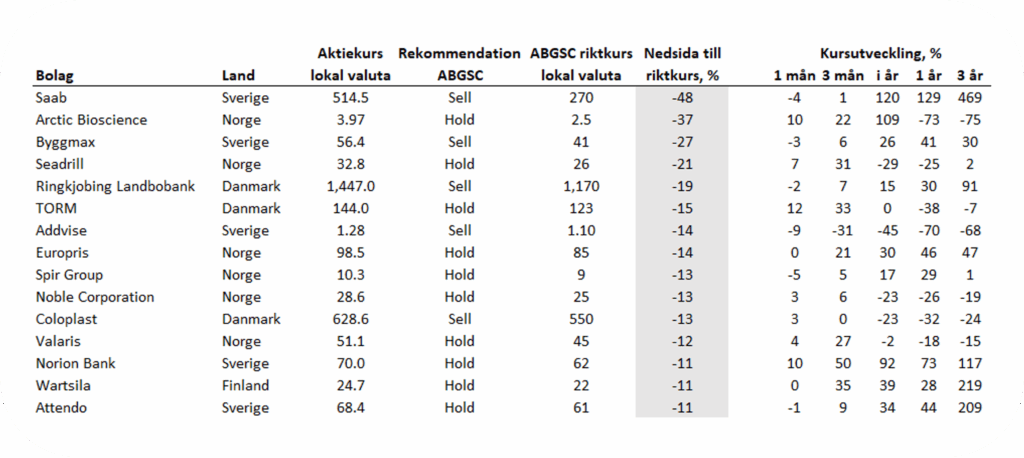 ABG Private Banking har också identifierat de bolag i ABGSC:s universum där analysavdelningen ser störst nedsida i förhållande till riktkurs. Dessa aktier kan därmed utgöra naturliga kandidater för att frigöra kapital till nya investeringar. I det svenska universet sticker bland annat Addvise, Saab, Byggmax, Tobii, Attendo och Telia ut.