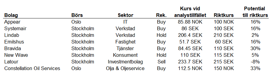 Störst uppsida i det nya bolagsuniverset ser analytikerna i installationsbolaget Bravida, med cirka 30 procents kurspotential till riktkurs. Även det norska oljeservicebolaget Constellation Oil Services sticker ut, med drygt 30 procents uppsida enligt analysen.