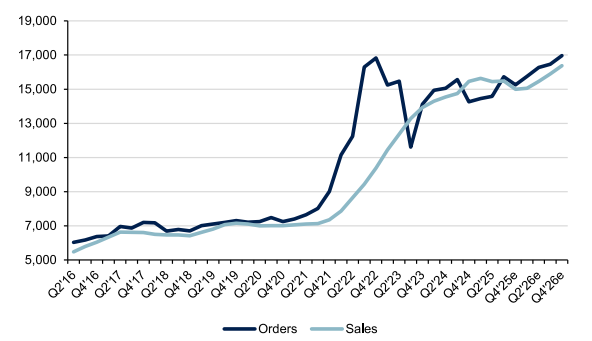 Efter Q3 har Munters dessutom säkrat sin hittills största enskilda order – 2 miljarder kronor från en hyperscaler den 12 november – följt av ytterligare en DCT-order på 775 miljoner kronor den 2 december. Detta bekräftar det förbättrade ordermomentum som syntes i rapporten och bidrog till att lyfta aktien 24 procent på rapportdagen. De nya affärerna bör driva upp konsensus för både Q4 och 2026. Efter orderboomen i Q4 väntas samtliga tre affärsområden visa vinsttillväxt redan i Q1 2026.