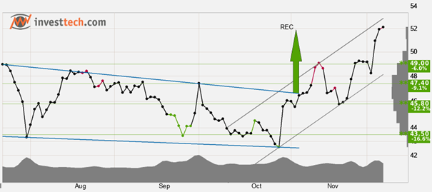 Bristol-Myers Squibb ligger i en stigande trendkanal på kort sikt. Detta signalerar ökande optimism bland investerare och indikerar ytterligare kursuppgång. Kursen har stigit kraftigt efter köpsignal från en rektangelformation vid brottet upp genom motståndet vid 46.64 USD. Målkursen vid 51.90 USD är nådd, men formationen signalerar fortsatt utveckling i samma riktning. Det saknas motstånd i kursdiagrammet och ytterligare uppgång indikeras. Vid reaktioner tillbaka har aktien stöd vid cirka 49.00 USD. Det kortsiktiga momentumet i aktien är starkt positivt, med RSI över 70. Det indikerar ökande optimism hos investerarna och ytterligare kursuppgång för Bristol-Myers Squibb. Speciellt i stora aktier har emellertid högt RSI varit ett tecken på att aktien är överköpt, och att det är fara för en reaktion ned. Aktien är totalt sett tekniskt positiv på kort sikt.