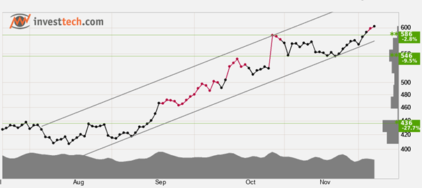 Investerare har över tid stadigt betalt allt högre priser för att köpa in sig i Caterpillar och aktien ligger i en stigande trendkanal på kort sikt. Stigande trender indikerar att bolaget är inne i en positiv utveckling och att köpintresset bland investerare ökar. Det saknas motstånd i kursdiagrammet och ytterligare uppgång indikeras. Vid reaktioner tillbaka har aktien stöd vid cirka 586 USD. RSI är över 70 efter en god kursuppgång de sista veckorna. Aktien har ett starkt positivt momentum och ytterligare uppgång indikeras. Speciellt i stora aktier har emellertid högt RSI varit ett tecken på att aktien är överköpt, och att det är fara för en reaktion ned. Aktien är totalt sett tekniskt positiv på kort sikt