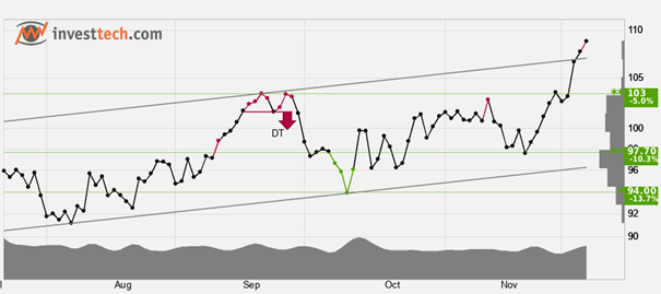 Citigroup har brutit den stigande trendkanalen uppåt på kort sikt. Det signalerar en starkare stigningstakt, men den starka uppgången kan ge reaktioner tillbaka på kort sikt. Det saknas motstånd i kursdiagrammet och ytterligare uppgång indikeras. Vid reaktioner tillbaka har aktien stöd vid cirka 103 USD. Volymtoppar och volymbottnar motsvaras väl av toppar och bottnar i kursen. Det styrker trendbilden. RSI över 70 visar att momentum i aktien är starkt positivt på kort sikt. Investerare har stadigt gått upp i pris för att kunna köpa aktien, något som indikerar ökande optimism och att kursen skall fortsätta upp. Speciellt i stora aktier har emellertid högt RSI varit ett tecken på att aktien är överköpt, och att det är fara för en reaktion ned. Aktien är totalt sett tekniskt positiv på kort sikt.
