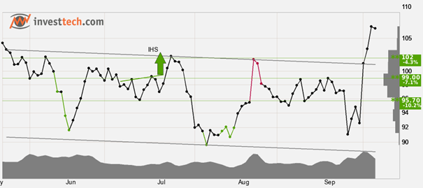 Ambu har brutit upp från en närmast horisontell trendkanal på kort sikt. Det signalerar en fortsatt stark utveckling. Aktien har nu stöd vid eventuella attacker tillbaka mot taket i trendkanalen. Det saknas motstånd i kursdiagrammet och ytterligare uppgång indikeras. Vid reaktioner tillbaka har aktien stöd vid cirka 102 kroner. Volymtoppar och volymbottnar motsvaras väl av toppar och bottnar i kursen. Det styrker trendbrottet. RSI-kurvan visar en stigande trend, vilket kan vara en signal om en stigande trend också för kursen. Aktien är totalt sett tekniskt positiv på kort sikt.
