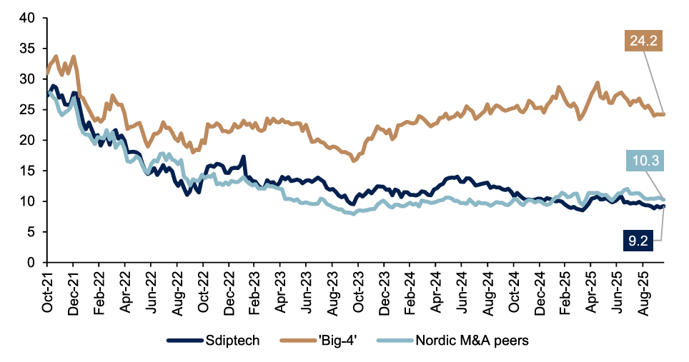 Sdiptech handlas till runt 9–10 gånger nästa års EBITA, vilket är attraktivt. Det kan jämföras med ett snitt på 24 gånger för de fyra stora serieförvärvarna och ungefär 10 gånger för bredare nordiska M&A-peers. Rabatten mot sektorn fångar enligt ABGSC:s analys ett väl pessimistiskt scenario – särskilt när bolaget nu visar förbättrat momentum i både lönsamhet och kassaflöde. Med stabila marginaler, förväntad återstart av förvärv under 2026 och potential till ett lyft i ROCE mot 14–15 procent, framstår en värdering runt 12 gånger EBITA som mer rimlig. Det motsvarar en möjlig uppsida på drygt 40 procent från dagens aktiekurs.