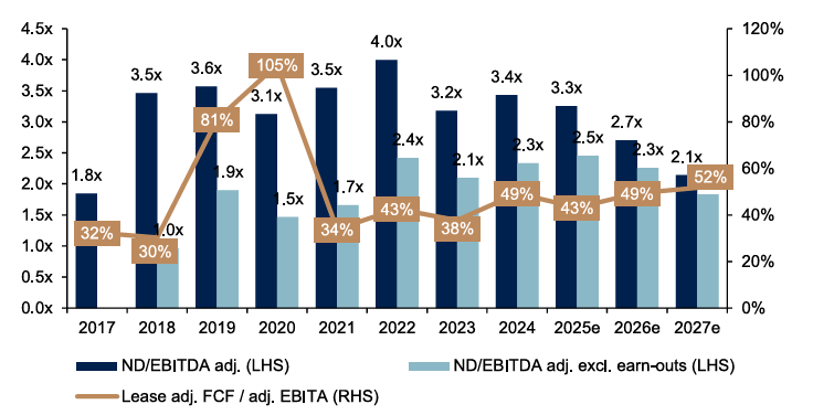 Skuldsättningen på 2,7 gånger EBITDA på nästa års prognos ger fortsatt utrymme för förvärv motsvarande mer än 5 procent EBITA-tillskott 2026 utan att gå över bolagets egen gräns på 3 gånger. Det ligger dessutom i linje med historiken – även om det senaste året präglats av lägre M&A-aktivitet.