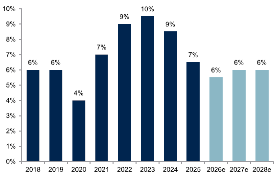 ABGSC estimerar en justerad EBITA-tillväxt om 11 procent för helåret 2026, efter en nedgång på 4 procent under 2025. Redan i det andra kvartalet väntas tillväxten accelerera till omkring 15 procent, delvis drivet av svaga jämförelsetal.