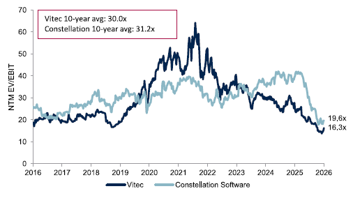 Framåtblickande EV/EBIT (NTM) – Vitec och Constellation Software